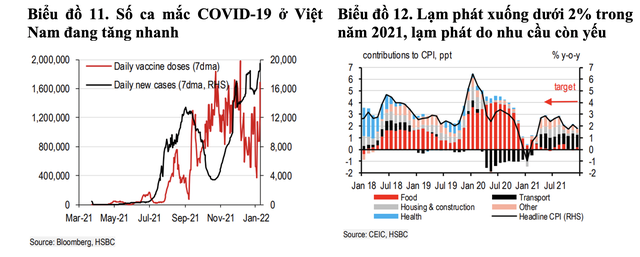 Theo HSBC, điều đáng mừng là tình hình triển khai vắc-xin của Việt Nam đã tốt hơn trước rất nhiều, đủ để tránh phải áp dụng biện pháp giãn cách diện rộng như trước đây. Tính đến cuối năm 2021, Việt Nam đã tiêm đủ liều cơ bản cho 70% dân số và bắt đầu tập trung triển khai tiêm mũi bổ sung cho người dân. Các cơ quan chức năng ngành y tế đã rút ngắn thời gian cho phép tiêm mũi bổ sung từ sáu tháng xuống còn ba tháng.