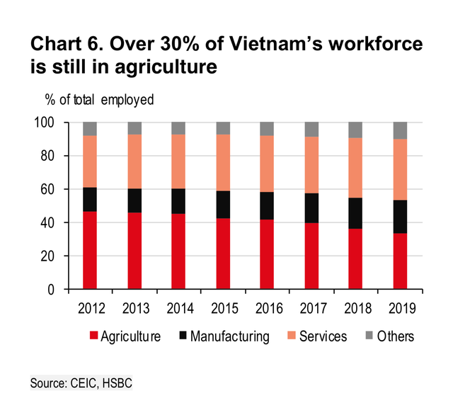 Theo bà Yun Liu, nhiệm vụ đầu tiên là nâng cao năng suất lao động thông qua giáo dục, đào tạo tay nghề có chất lượng tốt hơn và được thiết kế phù hợp hơn. Việc sẵn có lao động để chuyển sang lĩnh vực sản xuất năng suất cao hơn là một cơ hội, vì hơn một phần ba lực lượng lao động của Việt Nam vẫn tập trung trong nông nghiệp, thiếu năng suất là một thách thức (Biểu đồ 6).