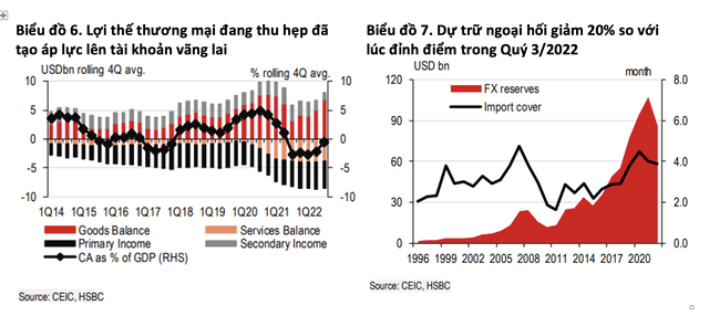Trong khi thặng dư thương mại cải thiện trong quý IV, HSBC cho biết, lợi thế về cán cân thương mại nói chung của Việt Nam lại một lần nữa thu hẹp do tình hình xuất khẩu chậm lại và nhập khẩu năng lượng tăng cao trong nửa đầu năm 2022. Điều đó dẫn đến mức thặng dư thương mại thấp, chỉ đạt 4,1 tỷ USD (1% GDP) trong năm 2022. Mức thặng dư thương mại thấp này nhiều khả năng sẽ không bù đắp được cho thâm hụt trong thu nhập chính và dịch vụ. Vì vậy, Việt Nam nhiều khả năng sẽ chứng kiến thâm hụt nhẹ tài khoản vãng lai năm thứ hai liên tiếp, khả năng rơi vào khoảng 1,4% GDP, ảnh hưởng đến tốc độ phục hồi đồng VND.