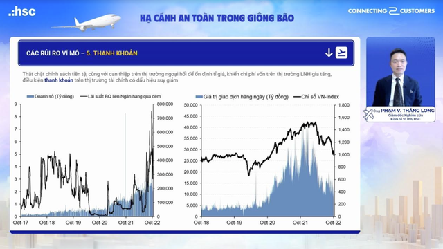 Về thanh khoản, trong môi trường thắt chặt chính sách tiền tệ, kèm theo đó là tác động kép tại Việt Nam, sự can thiệp trên thị trường ngoại hối để ổn định tỷ giá dẫn đến thiếu hụt thanh khoản trên thị trường. Có thể thấy, sự phản ứng mang tính tương quan mỗi khi lãi suất liên ngân hàng tăng trong thời gian dài, thị trường chứng khoán sẽ tiêu cực. Trong giai đoạn 2018, thị trường chứng khoán Việt Nam điều chỉnh 1.200 về 900 điểm, đây cũng là thời điểm lãi suất ngân hàng đang ở mức cao, song hiện nay còn cao hơn, có thời điểm lên đến 10%.