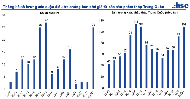 Tại hội thảo về ngành thép mới đây của CTCP Chứng khoán TP.HCM (HSC), bà Võ Thị Ngọc Hân, Giám đốc Nghiên cứu cao cấp, ngành công nghiệp và công nghệ chia sẻ, có 25 vụ kiện bán giá thép Trung Quốc trên toàn cầu tính đến giữa tháng 11/2024 khi sản lượng thép xuất khẩu của nước này tăng cao kỷ lục.