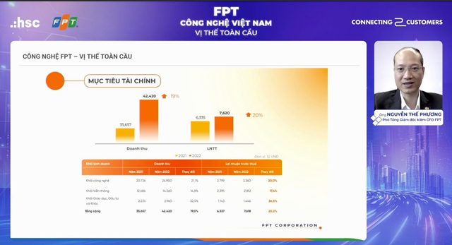Đầu năm nay, FPT đề ra mục tiêu tăng trưởng 19% doanh thu và trên 20% lợi nhuận sau thuế. Trong đó, mảng công nghệ tăng trên 20%, còn viễn thông khiêm tốn hơn tăng 15% doanh thu và 17% lợi nhuận. Giáo dục tăng 32% doanh thu và 26,5% lợi nhuận. Tuy nhiên, quý 1 thực hiện cao hơn và kỳ vọng năm 2022, FPT sẽ đạt được tăng trưởng cao hơn con số đề ra.