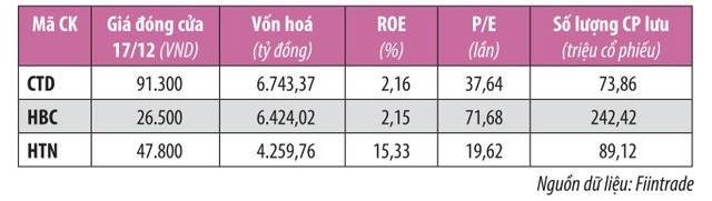Trong tốp 3 doanh nghiệp xây dựng dân dụng đang niêm yết trên thị trường chứng khoán gồm CTD, HBC, HTN thì HTN đang có sự vượt trội về các chỉ số tài chính, nhưng định giá cổ phiếu HTN còn khá khiêm tốn so với mặt bằng chung. Theo dữ liệu từ Fiintrade tại ngày 17/12/2021, ROE HTN ấn tượng 15,33%, nhưng vốn hoá và định giá theo P/E trailing 19,62 lần, thấp hơn so với CTD và HBC.