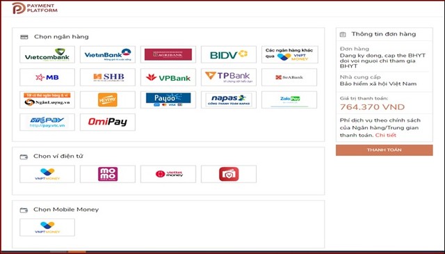 - Chọn "Thanh toán" để tiếp tục. Hệ thống sẽ điều hướng sang Nền tảng thanh toán quốc gia (Payment Platform) như hình dưới:
