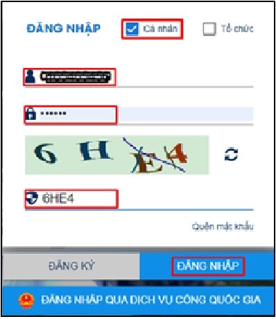 Lựa chọn đối tượng đăng nhập là "Cá nhân", nhập các thông tin: Tài khoản (mã số BHXH), mật khẩu, mã kiểm tra và chọn “Đăng nhập” như màn hình sau: