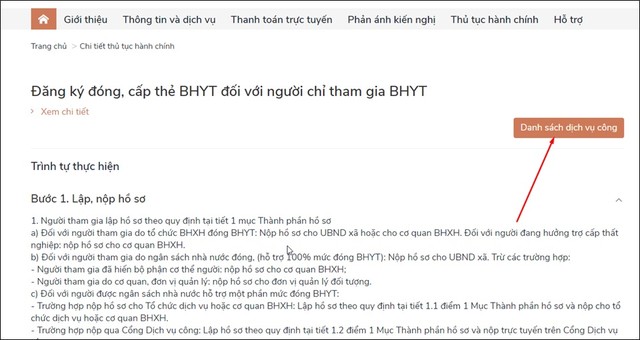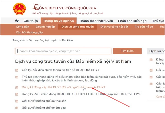 Bước 3. Chọn DVC: “Đăng ký đóng, cấp thẻ BHYT đối với người chỉ tham gia BHYT”.