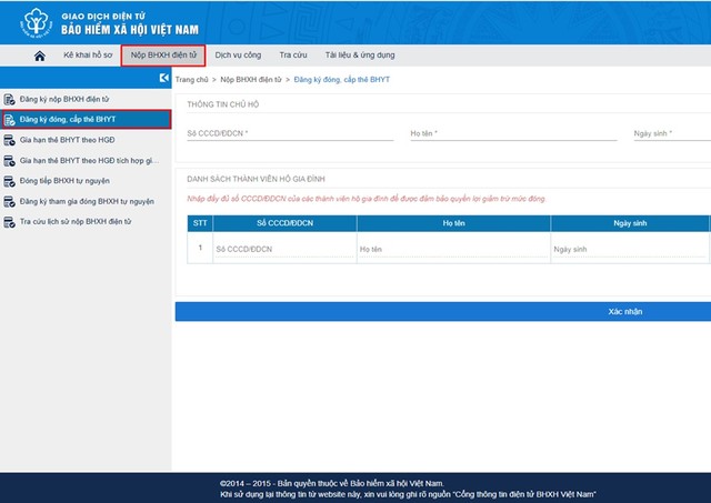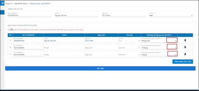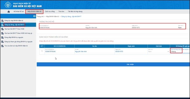 Sau khi kê khai đầy đủ các thành viên hộ gia đình, lựa chọn số tháng đăng ký, đóng BHYT, nhấn "Xác nhận". Hệ thống sẽ xác thực thông tin các thành viên hộ gia đình với Cơ sở dữ liệu quốc gia về dân cư: