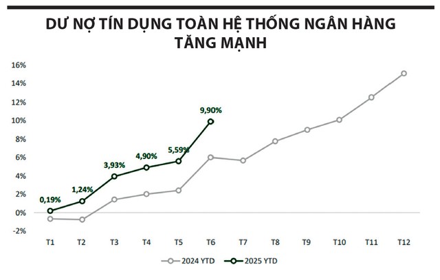 Tăng trưởng tín dụng ấn tượng với mức 9,9% trong 6 tháng đầu năm 2025, cao nhất kể từ năm 2023, cho thấy dòng vốn đang được đẩy mạnh vào các lĩnh vực sản xuất - kinh doanh và lĩnh vực ưu tiên, đặc biệt nhờ các chính sách như Nghị quyết số 68-NQ/TW về phát triển kinh tế tư nhân.