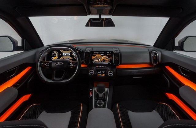 Bên trong, hãng xe Nga sử dụng các điểm nhấn màu cam, các chi tiết màu xám và viền nhôm để trang trí. Màn hình cảm ứng cho hệ thống thông tin giải trí tích hợp vào bảng điều khiển, cửa gió điều hòa cũng lấy cảm hứng từ chữ X.