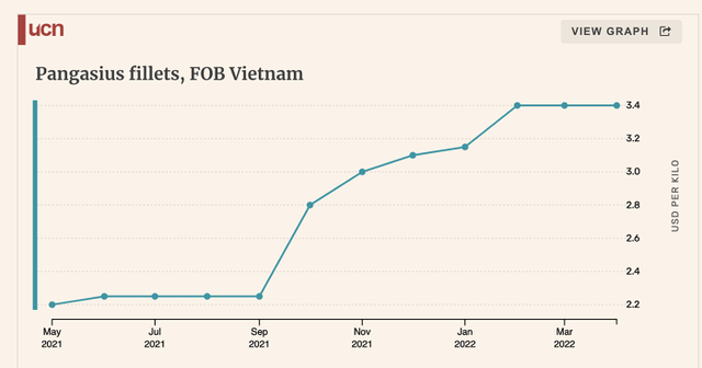 Giá cá tra nguyên liệu đang ổn định ở mức cao nhất từ trước đến nay. “Thị trường Việt Nam tiếp tục sôi động, giá cá tra ở ngưỡng cao vì thiếu cá cỡ nhỏ trong khi nhu cầu lớn. Sẽ cần một khoảng thời gian nhất định để nguồn cung ổn định trở lại. Tôi cho rằng sẽ mất khoảng 3 - 4 tháng để có hàng”, một nhà nhập khẩu tại Mỹ cho biết trên trang tin chuyên về thủy sản Undercurrent News.
