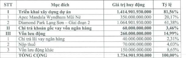 Số tiền thu được từ đợt phát hành, IDJ dự kiến sẽ dùng 81,56% để triển khai xây dựng dự án, trong đó dành 350 tỷ đồng triển khai dự án Apec Mandala Wyndham Mũi Né, dành hơn 1.064 tỷ đồng để triển khai dự án Diamond Park Lạng Sơn giai đoạn 2; còn lại 18,44% số tiền để chi trả khoản gốc vay vốn ngân hàng 60 tỷ đồng và dùng làm vốn lưu động 260 tỷ đồng.
