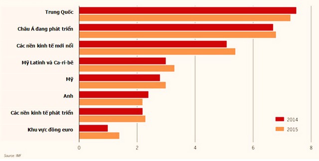 Với các nền kinh tế mới nổi, Quỹ dự báo, tăng trưởng sẽ cải thiện nhẹ lên mức 5,1% từ mức 4,7% của năm 2013, trong đó, kinh tế Trung Quốc có thể chậm hơn. Tăng trưởng nhanh hơn ở Trung Đông, châu Phi và Mỹ Latinh sẽ bù đắp nhiều hơn cho tăng trưởng chậm lại của Trung Quốc. Nền kinh tế lớn thứ hai thế giới này được Quỹ dự báo sẽ chỉ tăng trưởng 7,5% trong năm 2014 so với mức 7,7% của năm 2013.