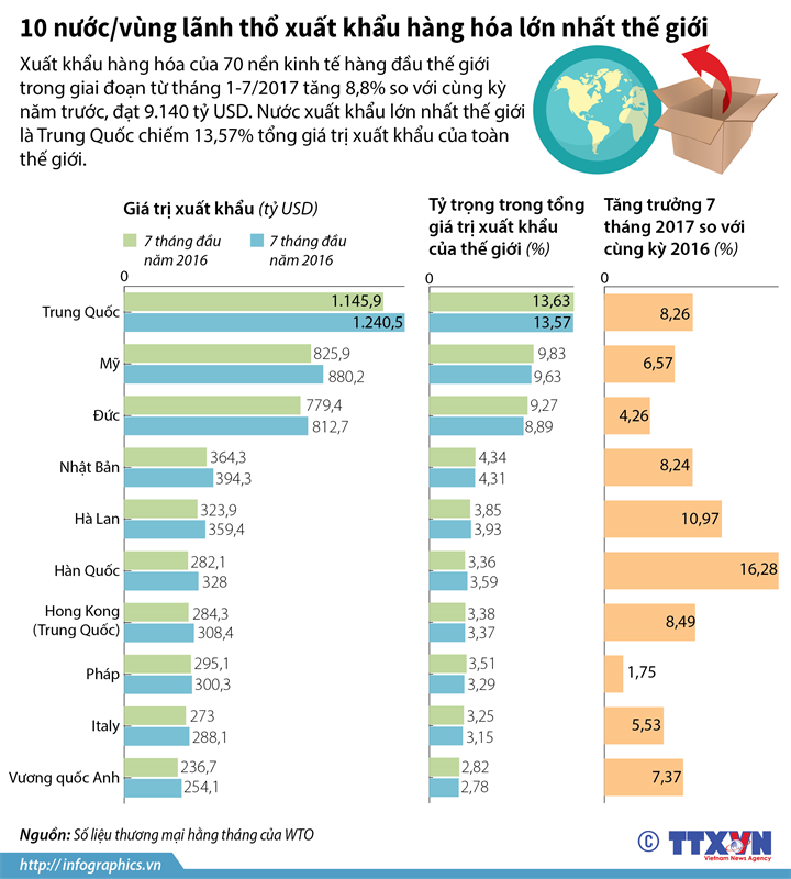Xuất khẩu hàng hóa của 70 nền kinh tế hàng đầu thế giới trong giai đoạn từ tháng 1-7/2017 tăng 8,8% so với cùng kỳ năm trước, đạt 9.140 tỷ USD. Nước xuất khẩu lớn nhất thế giới là Trung Quốc chiếm 13,57% tổng giá trị xuất khẩu của toàn thế giới.