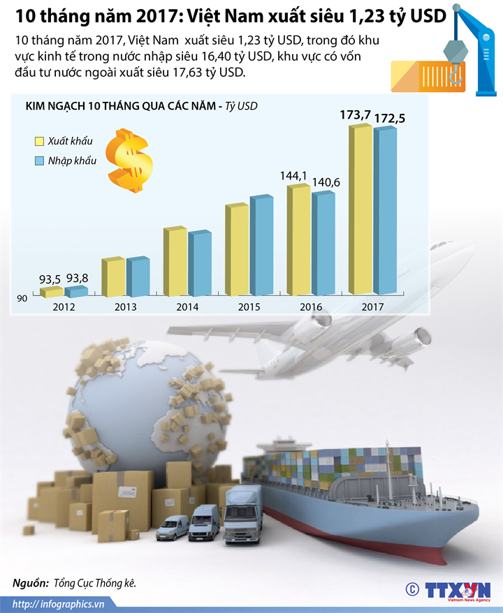 [Infographic] 10 tháng năm 2017: Việt Nam xuất siêu 1,23 tỷ USD