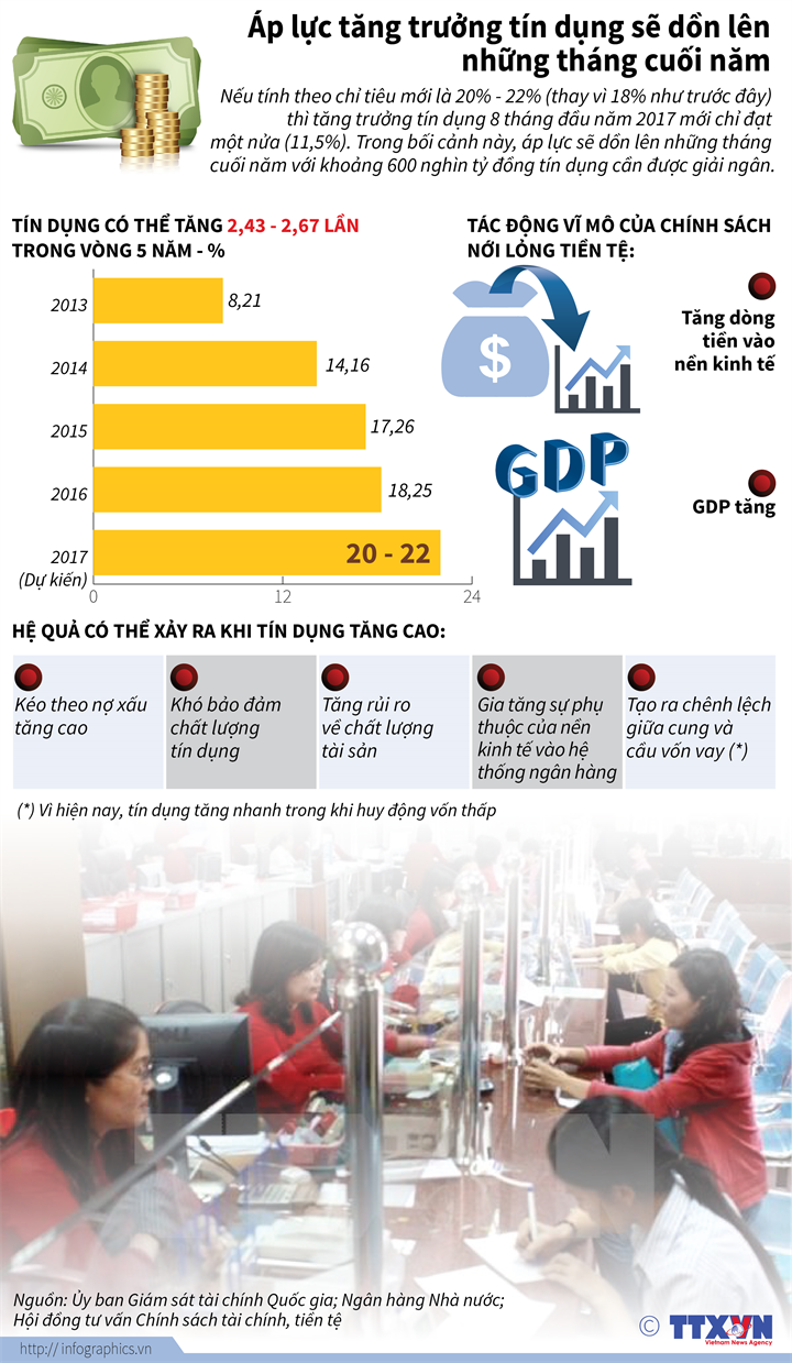 Nếu tính theo chỉ tiêu mới là 20% - 22% (thay vì 18% như trước đây) thì tăng trưởng tín dụng 8 tháng đầu năm 2017 mới chỉ đạt một nửa (11,5%). Trong bối cảnh này, áp lực sẽ dồn lên những tháng cuối năm với khoảng 600 nghìn tỷ đồng tín dụng cần được giải ngân.