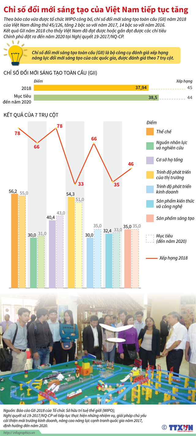 Theo báo cáo vừa được tổ chức WIPO công bố, chỉ số đổi mới sáng tạo toàn cầu (GII) năm 2018 của Việt Nam đứng thứ 45/126, tăng 2 bậc so với năm 2017, 14 bậc so với năm 2016. Kết quả GII năm 2018 cho thấy Việt Nam đã đạt được hoặc gần đạt được các chỉ tiêu Chính phủ đặt ra đến năm 2020 tại Nghị quyết 19-2017/NQ-CP.
