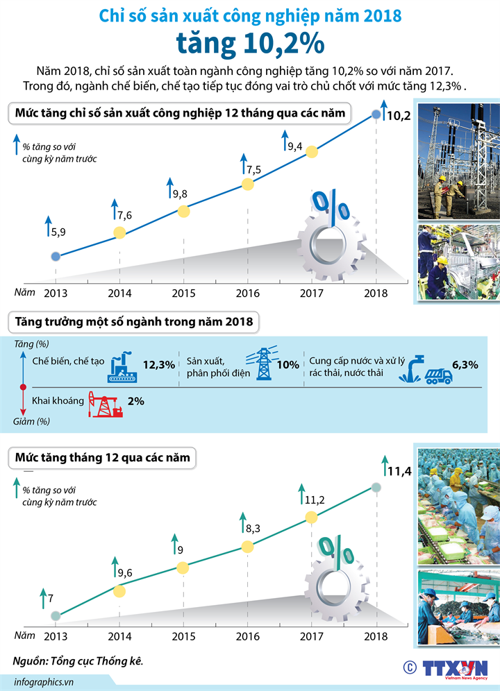 Năm 2018, chỉ số sản xuất toàn ngành công nghiệp tăng 10,2% so với năm 2017. Trong đó, ngành chế biến, chế tạo tiếp tục đóng vai trò chủ chốt với mức tăng 12,3%.