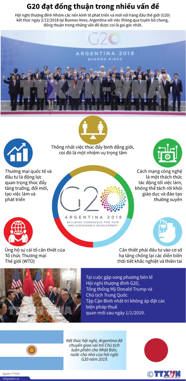 Hội nghị thượng đỉnh Nhóm các nền kinh tế phát triển và mới nổi hàng đầu thế giới (G20) kết thúc ngày 2/12/2018 với việc thông qua tuyên bố chung, đồng thuận trong những vấn đề được coi là gai góc nhất.