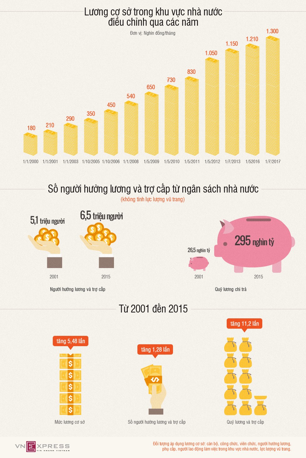Từ 2001 đến 2016, mức lương cơ sở tăng 5,7 lần, từ 210.000 đồng lên 1,21 triệu đồng. Trong khi đó, Bộ Nội vụ cho rằng lương đảm bảo mức sống tối thiểu là 3,3 triệu đồng.
