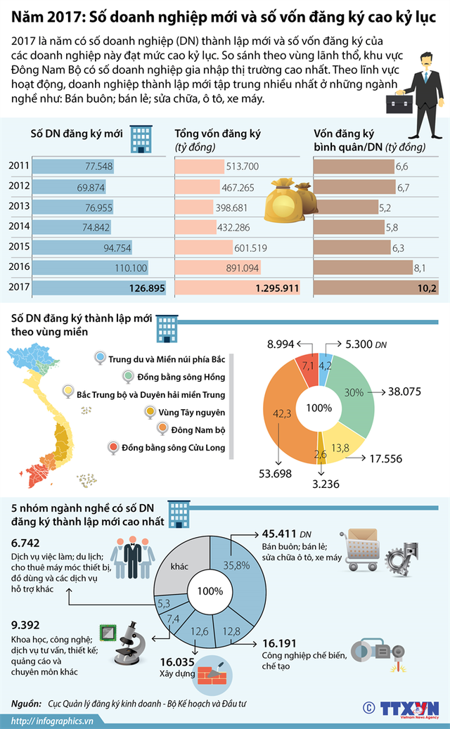 2017 là năm có số doanh nghiệp (DN) thành lập mới và số vốn đăng ký của các doanh nghiệp này đạt mức cao kỷ lục. So sánh theo vùng lãnh thổ, khu vực Đông Nam Bộ có số doanh nghiệp gia nhập thị trường cao nhất. Theo lĩnh vực hoạt động, doanh nghiệp thành lập mới tập trung nhiều nhất ở những ngành nghề như: Bán buôn; bán lẻ; sửa chữa, ô tô, xe máy.