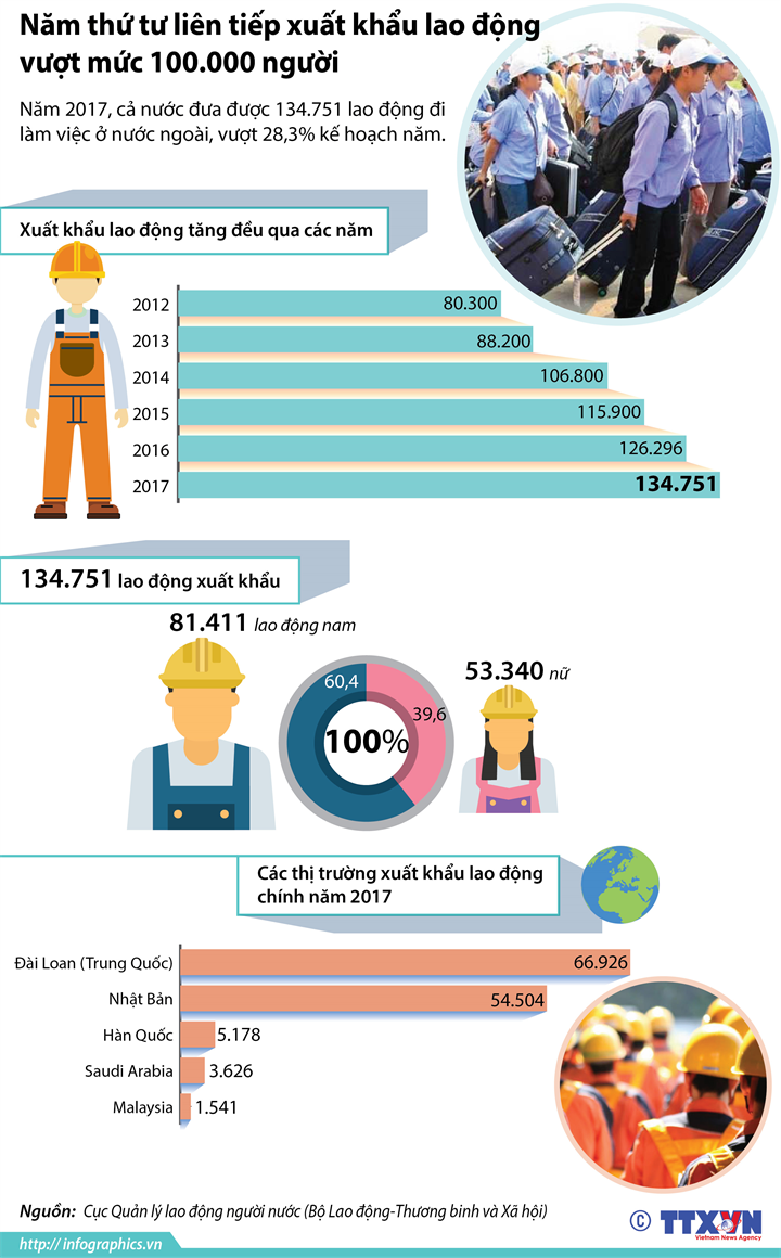 Năm 2017, cả nước đưa được 134.751 lao động đi làm việc ở nước ngoài, vượt 28,3% kế hoạch năm.