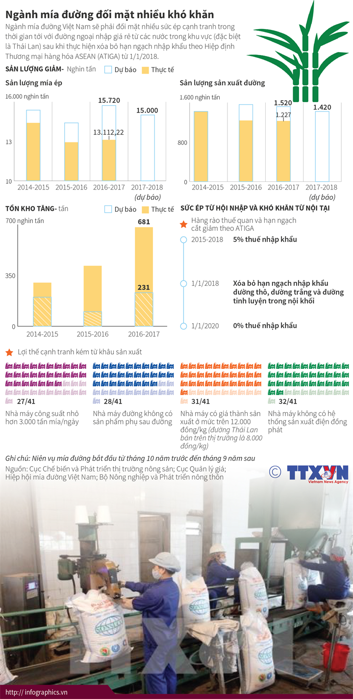 Ngành mía đường Việt Nam sẽ phải đối mặt nhiều sức ép cạnh tranh trong thời gian tới với đường ngoại nhập giá rẻ từ các nước trong khu vực (đặc biệt là Thái Lan) sau khi thực hiện xóa bỏ hạn ngạch nhập khẩu theo Hiệp định Thương mại hàng hóa ASEAN (ATIGA) từ 1/1/2018.