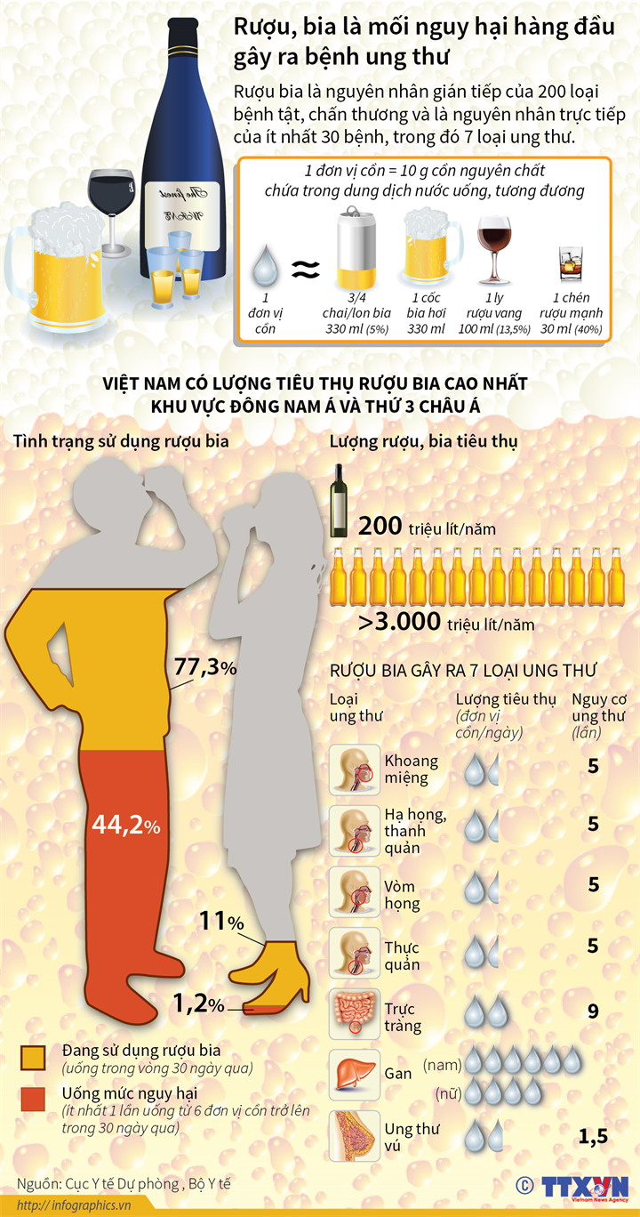 [Infographic] Rượu, bia là mối nguy hại hàng đầu gây ra bệnh ung thư
