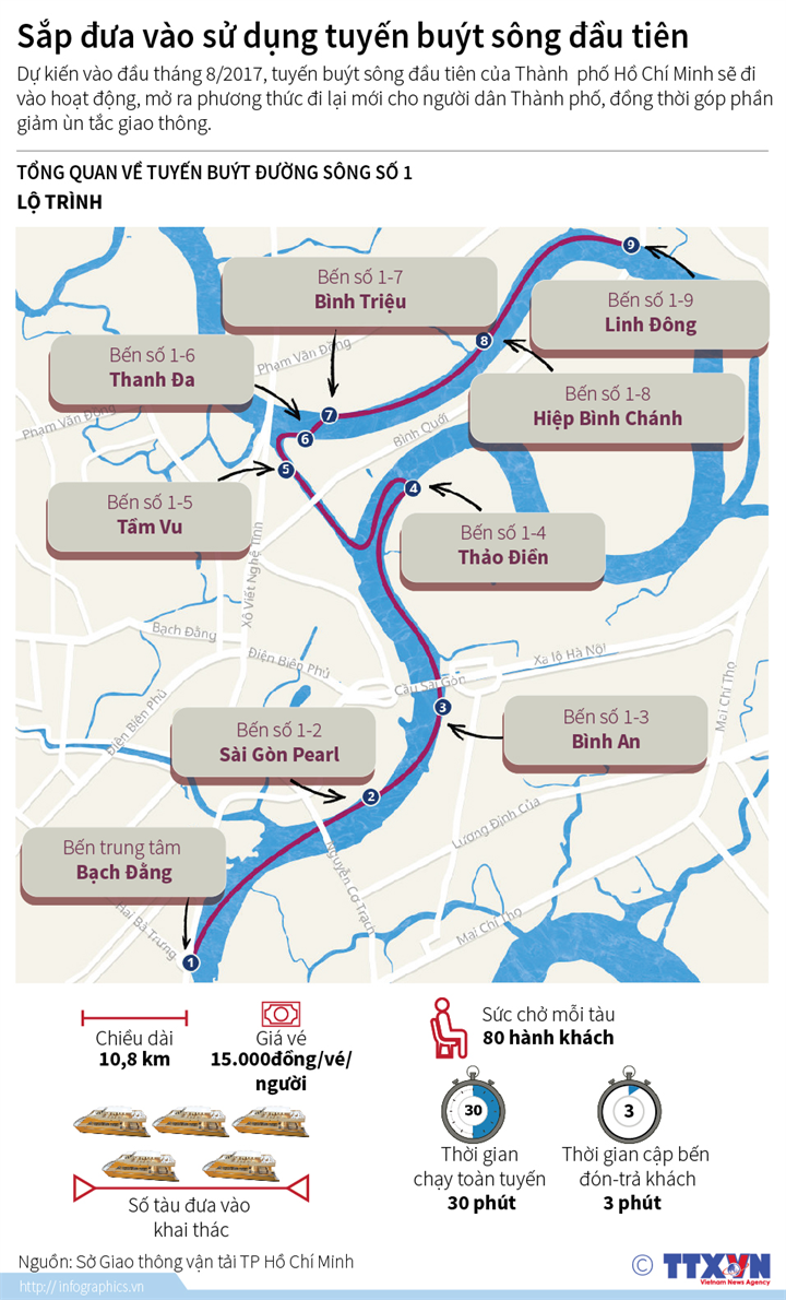 Dự kiến vào đầu tháng 8/2017, tuyến buýt sông đầu tiên của Thành phố Hồ Chí Minh sẽ đi vào hoạt động, mở ra phương thức đi lại mới cho người dân Thành phố, đồng thời góp phần giảm ùn tắc giao thông.