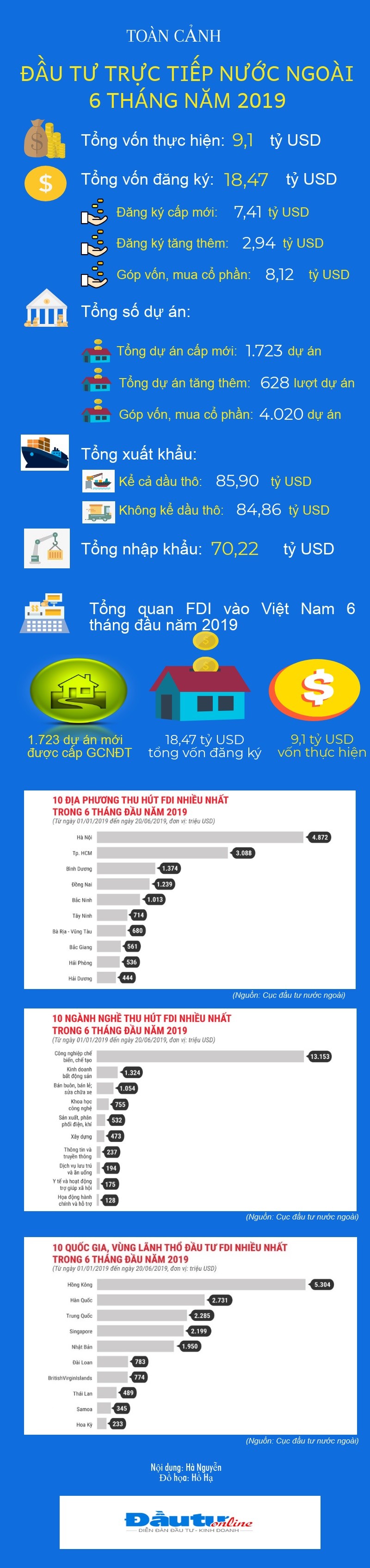 [Infographic] Toàn cảnh đầu tư trực tiếp nước ngoài 6 tháng năm 2019