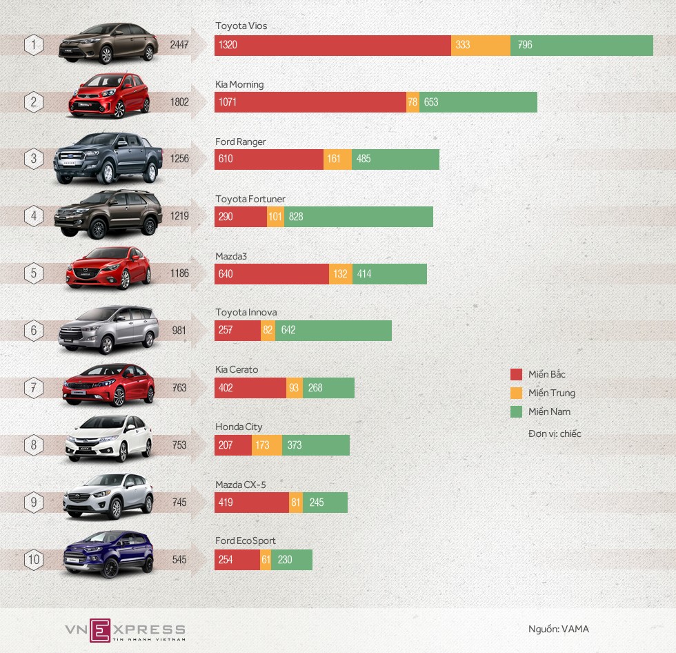 Toyota Vios vẫn khẳng định sức mạnh với doanh số trên 2.000 chiếc. Trường Hải bám sát với Kia Morning, Mazda3 và CX-5.