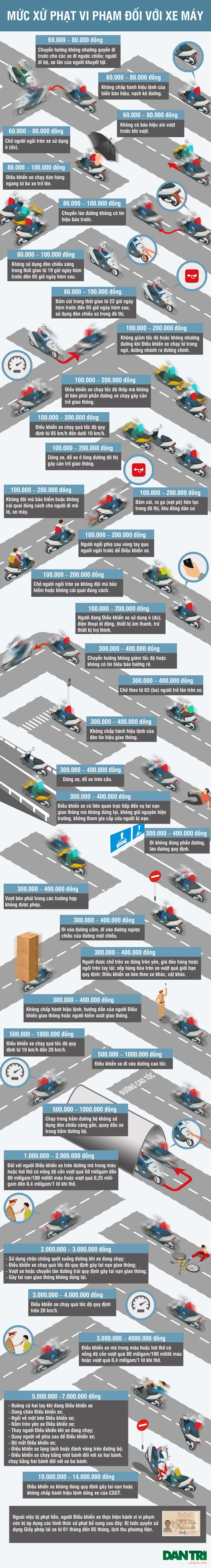 Điều 6 Thông tư 46/2016/NĐ-CP quy định về xử phạt người điều khiển, người ngồi trên xe mô-tô, xe gắn máy (kể cả xe máy điện), các loại xe tương tự xe mô-tô và các loại xe tương tự xe gắn máy vi phạm quy tắc giao thông đường bộ...Trong đó, mức xử phạt vi phạm đối với xe máy có lên mức 14 triệu đồng - gần bằng giá trị một chiếc xe máy phổ biến hiện nay.