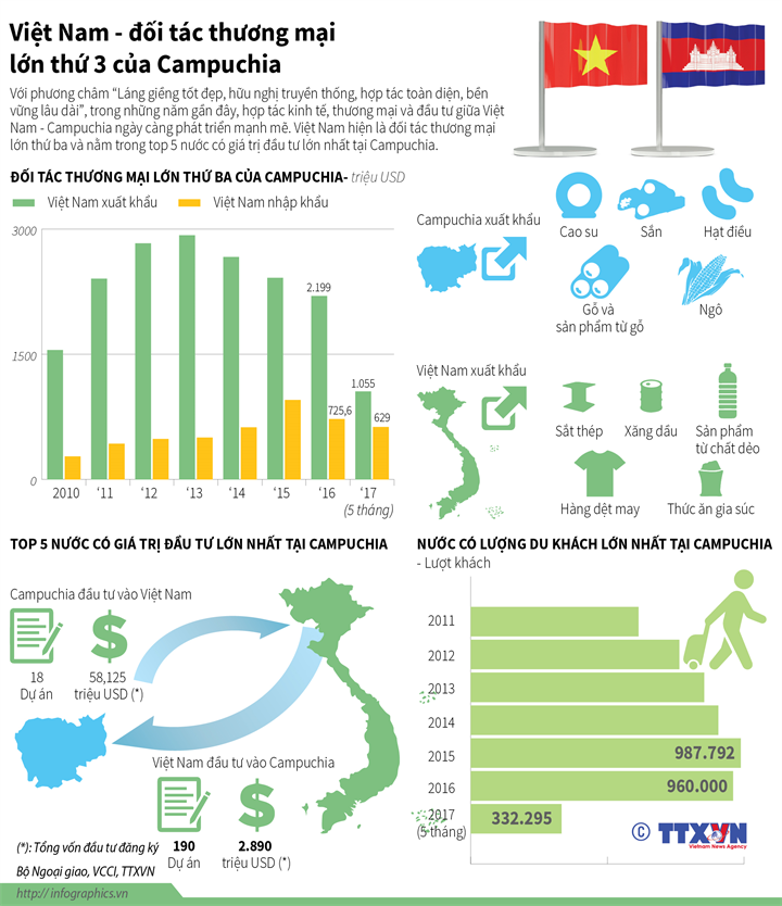 Với phương châm “Láng giềng tốt đẹp, hữu nghị truyền thống, hợp tác toàn diện, bền vững lâu dài”, trong những năm gần đây, hợp tác kinh tế, thương mại và đầu tư giữa Việt Nam - Campuchia ngày càng phát triển mạnh mẽ. Việt Nam hiện là đối tác thương mại lớn thứ ba và nằm trong top 5 nước có giá trị đầu tư lớn nhất tại Campuchia.