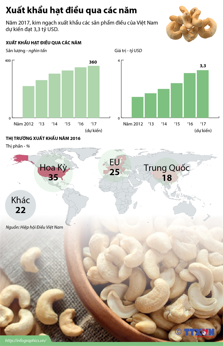 Năm 2017, kim ngạch xuất khẩu các sản phẩm điều của Việt Nam dự kiến đạt 3,3 tỷ USD.