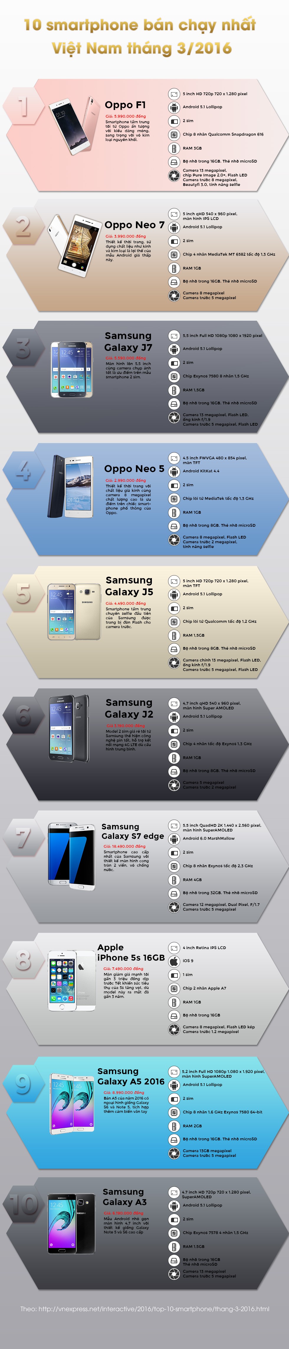 [infoGraphics] 10 smartphone bán chạy nhất Việt Nam tháng 3/2016