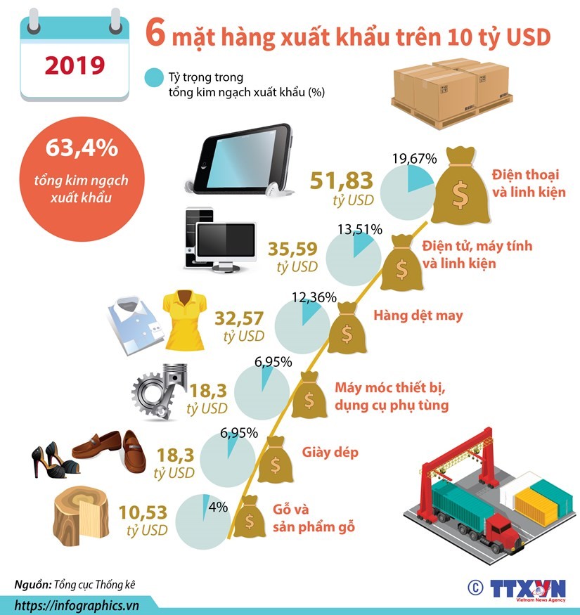 [Infographics] 6 mặt hàng có giá trị xuất khẩu trên 10 tỷ USD