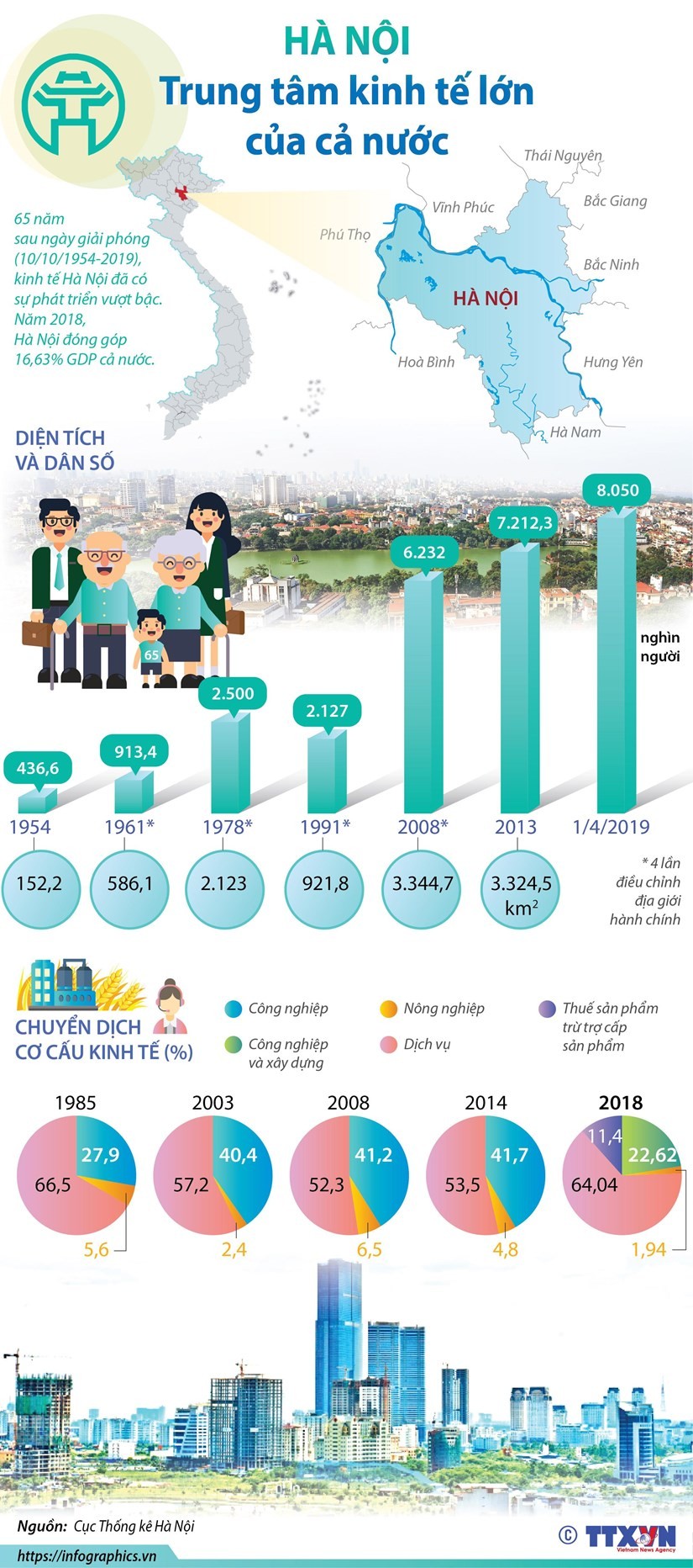 65 năm sau ngày giải phóng, kinh tế Hà Nội đã có sự phát triển vượt bậc, đóng góp 16,63% GDP cả nước (năm 2018) và cơ cấu chuyển dịch tích cực.