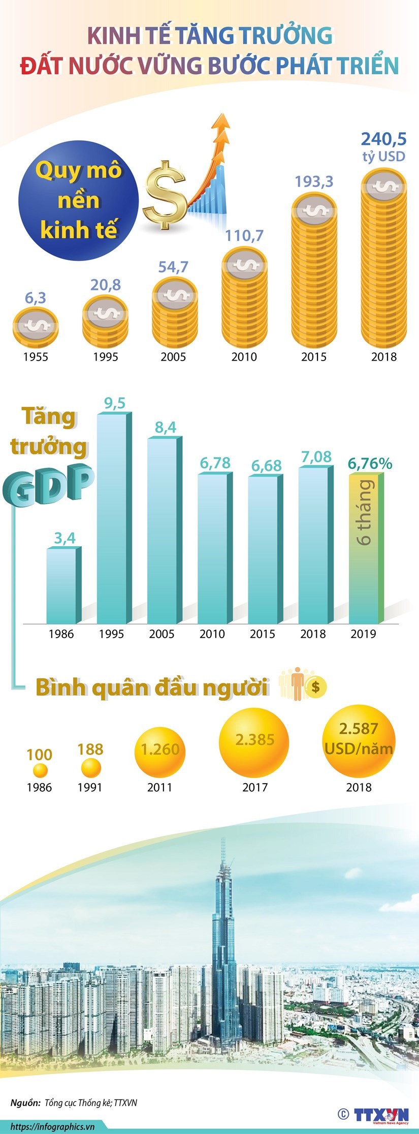 Theo số liệu của Tổng cục Thống kê, nếu năm 1955, quy mô nền kinh tế Việt Nam là 6,3 tỷ USD thì đến năm 2018, con số này đã là 240,5 tỷ USD.