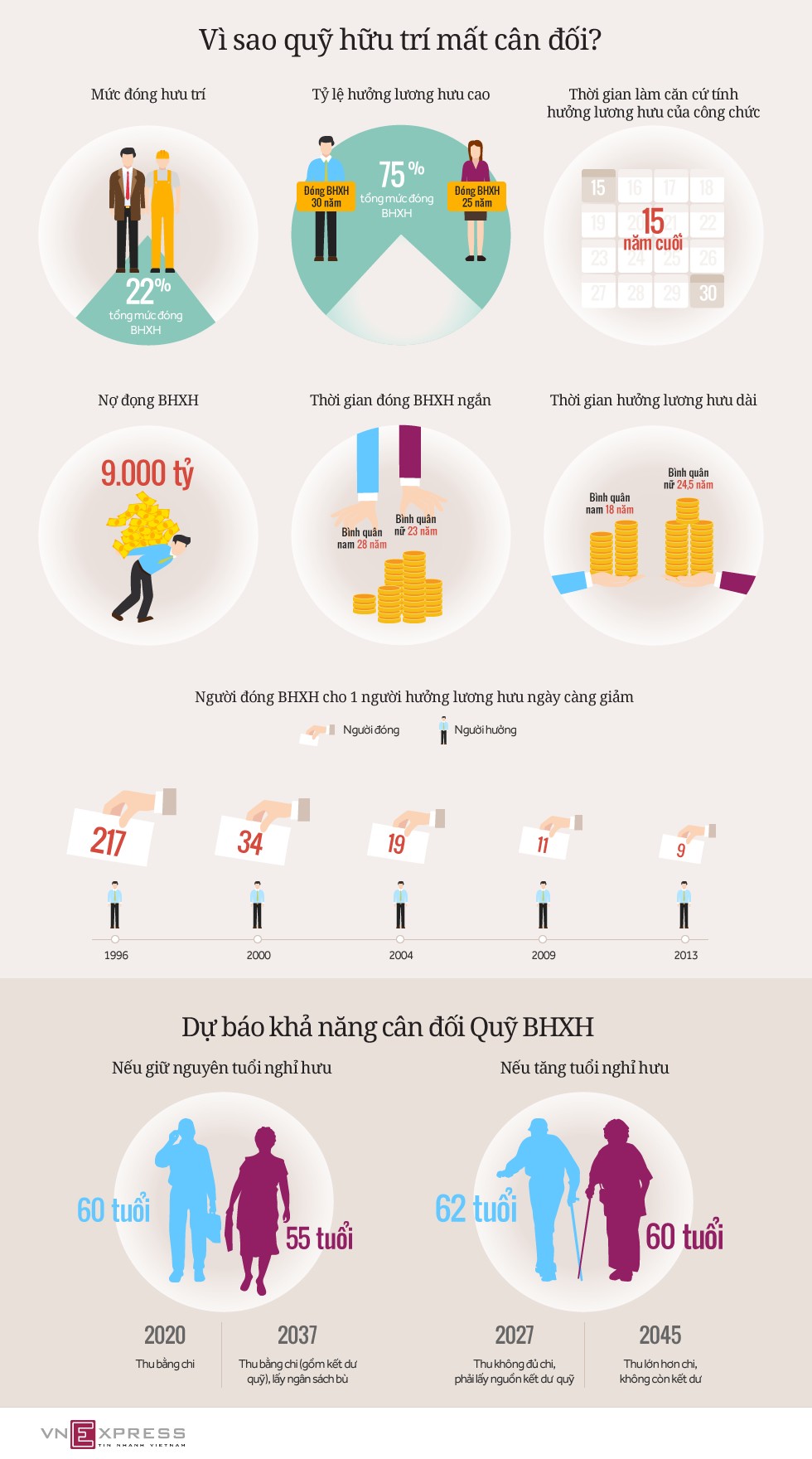 Tỷ lệ đóng góp thấp, mức hưởng lương hưu khối công chức cao, nợ đọng bảo hiểm đến 9.000 tỷ... là 3 trong số những yếu tố có thể gây "vỡ quỹ" hưu trí.