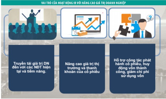Một là doanh nghiệp cần có nhân sự, bộ phận chuyên trách về IR (thông lệ quản trị tốt). Nhân sự này phải có kiến thức, kinh nghiệm về tài chính, thị trường vốn; hiểu biết thấu đáo về hoạt động của công ty, có mối liên hệ chặt chẽ với các vị trí quản lý, điều hành cấp cao của công ty. Hiểu thị trường - hiểu mình để đảm bảo công bố thông tin đều đặn, đúng thời điểm, đúng nhu cầu thị trường.