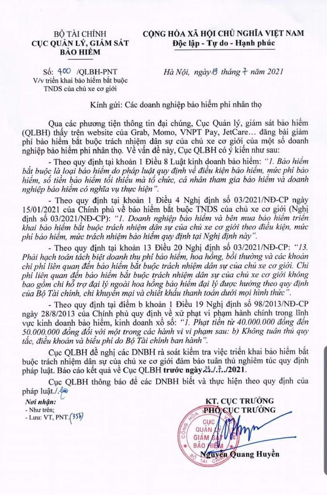 Cụ thể, ngày 19/7, Cục Quản lý và giám sát bảo hiểm (Bộ Tài chính) đã có công văn số 400/QLBH-PNT đề nghị các công ty bảo hiểm nhân thọ rà soát việc triển khai bảo hiểm trách nhiệm dân sự xe cơ giới đảm bảo tuân thủ nghiêm túc quy định pháp luật, báo cáo kết quả về cơ quan này trước ngày 23/7/2021. Công văn do Phó Cục trưởng Nguyễn Quang Huyền ký.