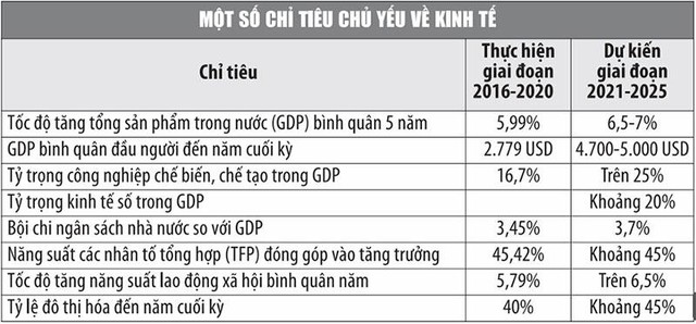 Trong 23 chỉ tiêu phát triển kinh tế - xã hội 5 năm 2021-2025, có một chỉ tiêu rất đáng chú ý, đó là tỷ trọng công nghiệp chế biến, chế tạo trong GDP đạt trên 25%; kinh tế số đạt khoảng 20% GDP. Đây chính là biểu hiện rõ nét của một nền kinh tế đang phát triển “có công nghiệp theo hướng hiện đại”, mục tiêu đã đặt ra vào năm 2020 nhưng chưa đạt được.