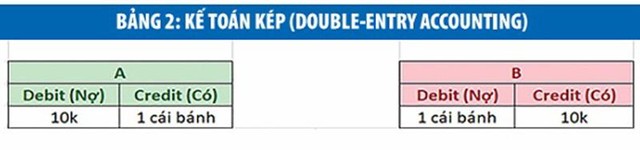 Do đó, kế toán kép ra đời và giải quyết được vấn đề này, sẽ không để xảy ra “sai phạm trọng yếu” nhờ vào ghi chép theo ghi nợ (debit) và ghi có (credit) kèm hóa đơn, chứng từ sổ sách kế toán (Bảng 2). Nếu có gì lộn xộn sẽ có đầy đủ giấy tờ để xác minh lại.