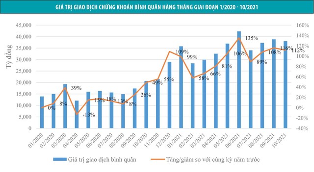 Theo thống kê của Ủy ban Chứng khoán Nhà nước, trong 10 tháng đầu năm 2021, có tới 6 tháng giá trị giao dịch bình quân toàn thị trường (bao gồm HOSE, HNX và UPCoM) tăng trên 100% so với cùng kỳ năm 2020. Còn theo số liệu của Trung tâm Lưu ký chứng khoán Việt Nam, trong 10 tháng, nhà đầu tư cá nhân trong nước đã mở mới gần 1,09 triệu tài khoản chứng khoán, gấp 3 lần cả năm 2020 và cao hơn tổng số tài khoản đã được nhóm này mở trong giai đoạn 2017 - 2020.