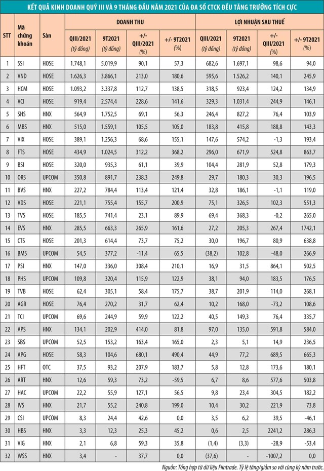 Kết thúc 9 tháng 2021, nhiều công ty chứng khoán (CTCK) đã báo cáo kết quả kinh doanh rất tích cực với lợi nhuận vượt xa kế hoạch đề ra và tăng trưởng mạnh mẽ so với cùng kỳ những năm trước.