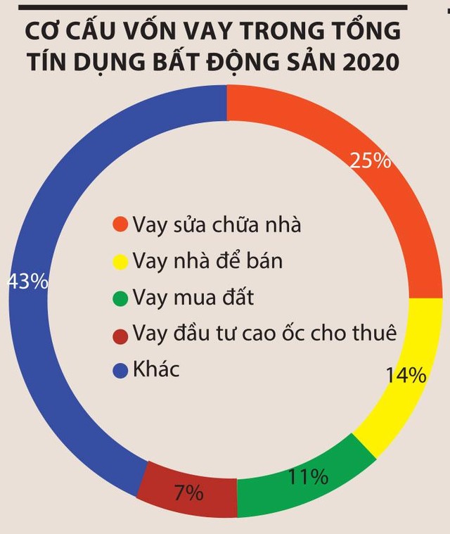 Tính đến hết quý III/2020, dư nợ tín dụng đối với hoạt động kinh doanh bất động sản đạt 580.168 tỷ đồng. Trong đó, dư nợ tín dụng đối với các dự án khu đô thị, dự án phát triển nhà ở và sửa chữa, cải tạo nhà là 145.099 tỷ đồng (chiếm tỷ lệ 25%); các dự án văn phòng (cao ốc) cho thuê là 40.396 tỷ đồng (7%); các dự án xây dựng khu công nghiệp, khu chế xuất là 21.177 tỷ đồng (3,7%); các dự án khu du lịch, sinh thái, nghỉ dưỡng là 21.436 tỷ đồng (3,7%); các dự án nhà hàng, khách sạn là 54.585 tỷ đồng (4%); cho vay xây dựng, sửa chữa nhà để bán là 84.720 tỷ đồng (14,6%); cho vay mua quyền sử dụng đất là 65.420 tỷ đồng (11,3%); đầu tư kinh doanh bất động sản khác là 147.335 tỷ đồng (25,3%).