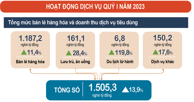 Tổng mức bán lẻ hàng hóa và doanh thu dịch vụ tiêu dùng tháng 3 ước đạt 501,3 nghìn tỷ đồng, tăng 2,0% so với tháng trước và tăng 13,4% so với cùng kỳ năm trước. Tính chung quý I/2023, tổng mức bán lẻ hàng hóa và doanh thu dịch vụ tiêu dùng ước đạt 1.505,3 nghìn tỷ đồng, tăng 13,9% so với cùng kỳ năm trước (cùng kỳ năm 2022 tăng 5%), nếu loại trừ yếu tố giá tăng 10,3% (cùng kỳ năm 2022 tăng 2%).
