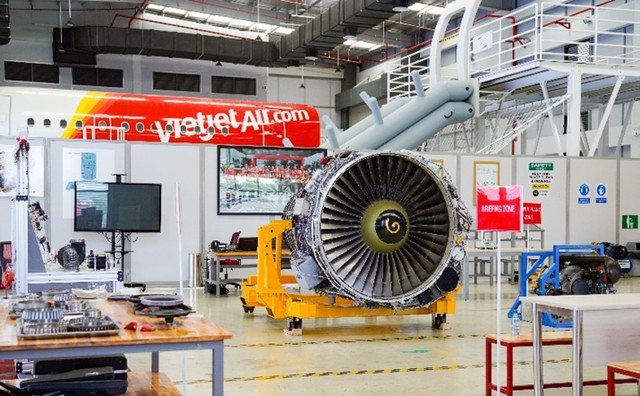 Tại Học viện Hàng không Vietjet, một trung tâm đào tạo kỹ thuật cũng đang hoạt động với các trang thiết bị, động cơ hiện đại.