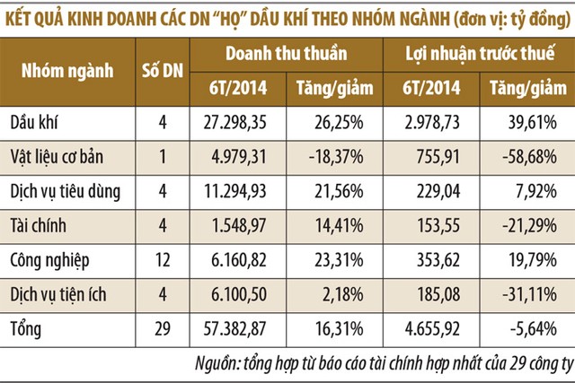 Tham khảo tiêu chí phân ngành của CTCK Dầu khí (PSI), các DN dầu khí được phân thành 6 nhóm ngành là công nghiệp, tài chính, dầu khí, dịch vụ tiện ích, dịch vụ tiêu dùng và vật liệu cơ bản. Trong đó, 29 DN đã công bố BCTC hợp nhất, tính cả BCTC của những DN không có đơn vị thành viên và liên kết. Doanh thu hợp nhất của 29 DN này đạt 57.383 tỷ đồng trong 6 tháng đầu năm, tăng 16,3%; lợi nhuận đạt 4.656 tỷ đồng, giảm 5,64% so với cùng kỳ năm ngoái.