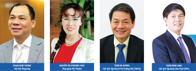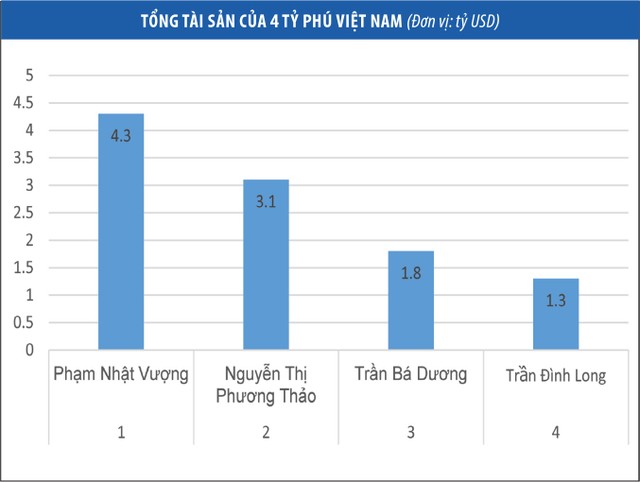 Bốn doanh nhân Việt Nam sở hữu khối tài sản trị giá lần lượt là 4,3 tỷ USD; 3,1 tỷ USD; 1,8 tỷ USD và 1,3 tỷ USD, đang mang trên mình sứ mệnh lãnh đạo các doanh nghiệp hàng đầu Việt Nam, với khát vọng vươn tầm.