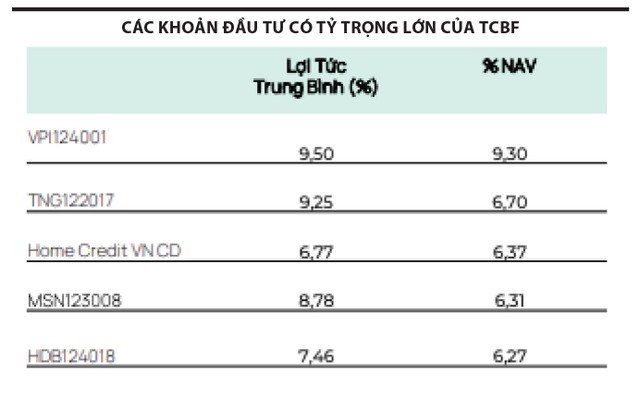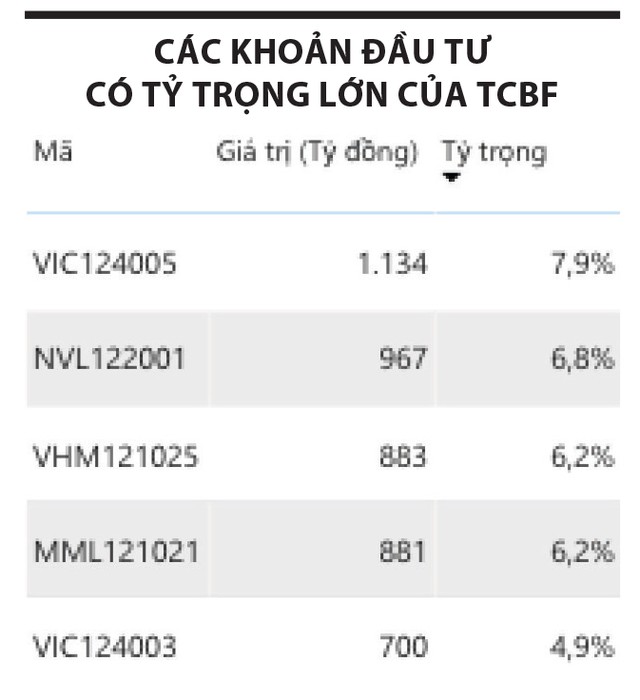 Trong danh mục đầu tư của TCBF, trái phiếu do hệ sinh thái Vingroup phát hành chiếm tỷ trọng lớn nhất. Trong đó, mã trái phiếu VIC124005 do Vingroup phát hành ngày 26/3/2024 chiếm tỷ trọng 7,9%. Đây là trái phiếu có kỳ hạn 36 tháng, trong 2 kỳ tính lãi đầu tiên, lãi suất là 15%/năm. Các kỳ tính lãi tiếp theo, trái phiếu được hưởng lãi suất bằng lãi suất tham chiếu cộng 4,5%/năm.